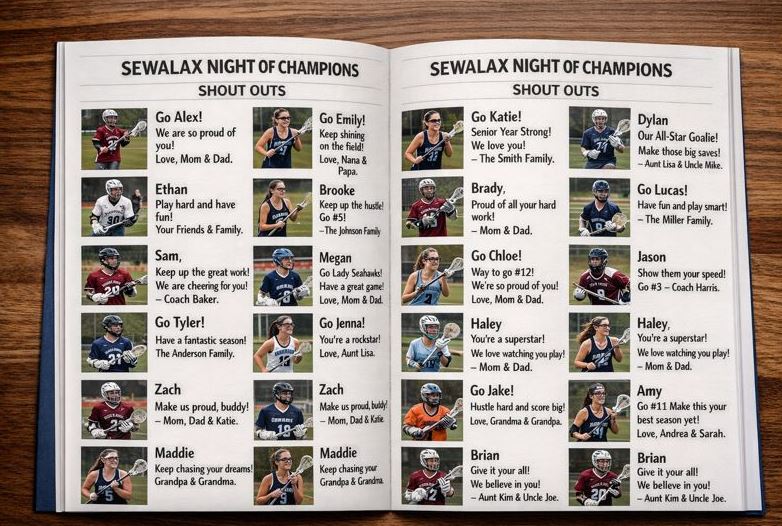 Celebrate the athletes, coaches, officials, and volunteers who made this season unforgettable! Purchase a Lax Legend Shout Out to honor your favorite player, recognize a graduating senior, or thank an unsung hero with a personalized message and photo in our official Night of Champions printed program.